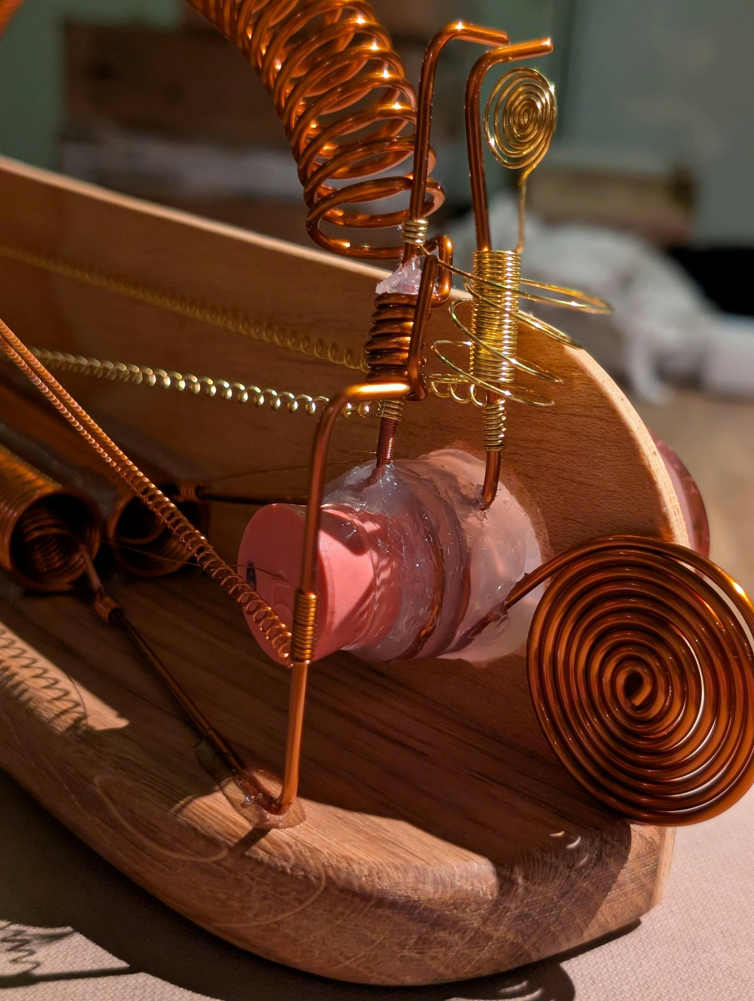 The DreamScape Navigator, comprising two glass spheres and copper and brass circuitry, is like a dreamcatcher receiver for conscious evolution through the enhancement of your power to dream—both when sleeping, and in the wake state, when you exercise your power of imagination. The wooden body is hand made, as well as the two lateral blown glass spheres.